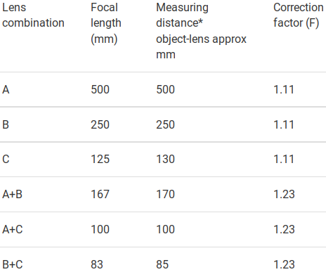The following table applies when using close-up lenses with the Hagner Universal Photometer, model S3, S4 and S5